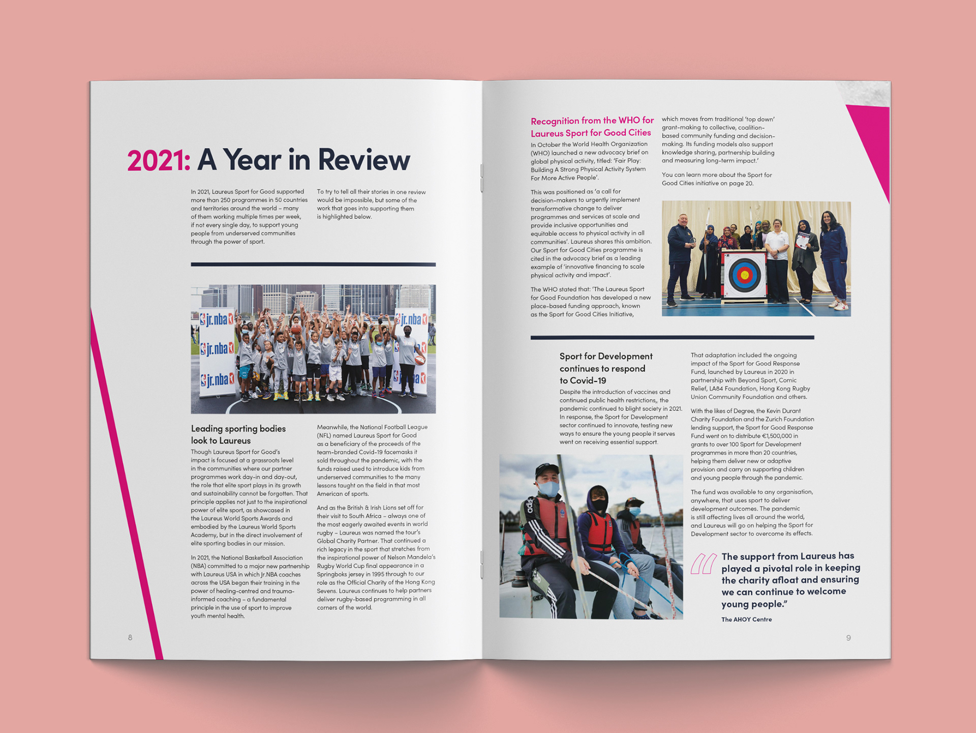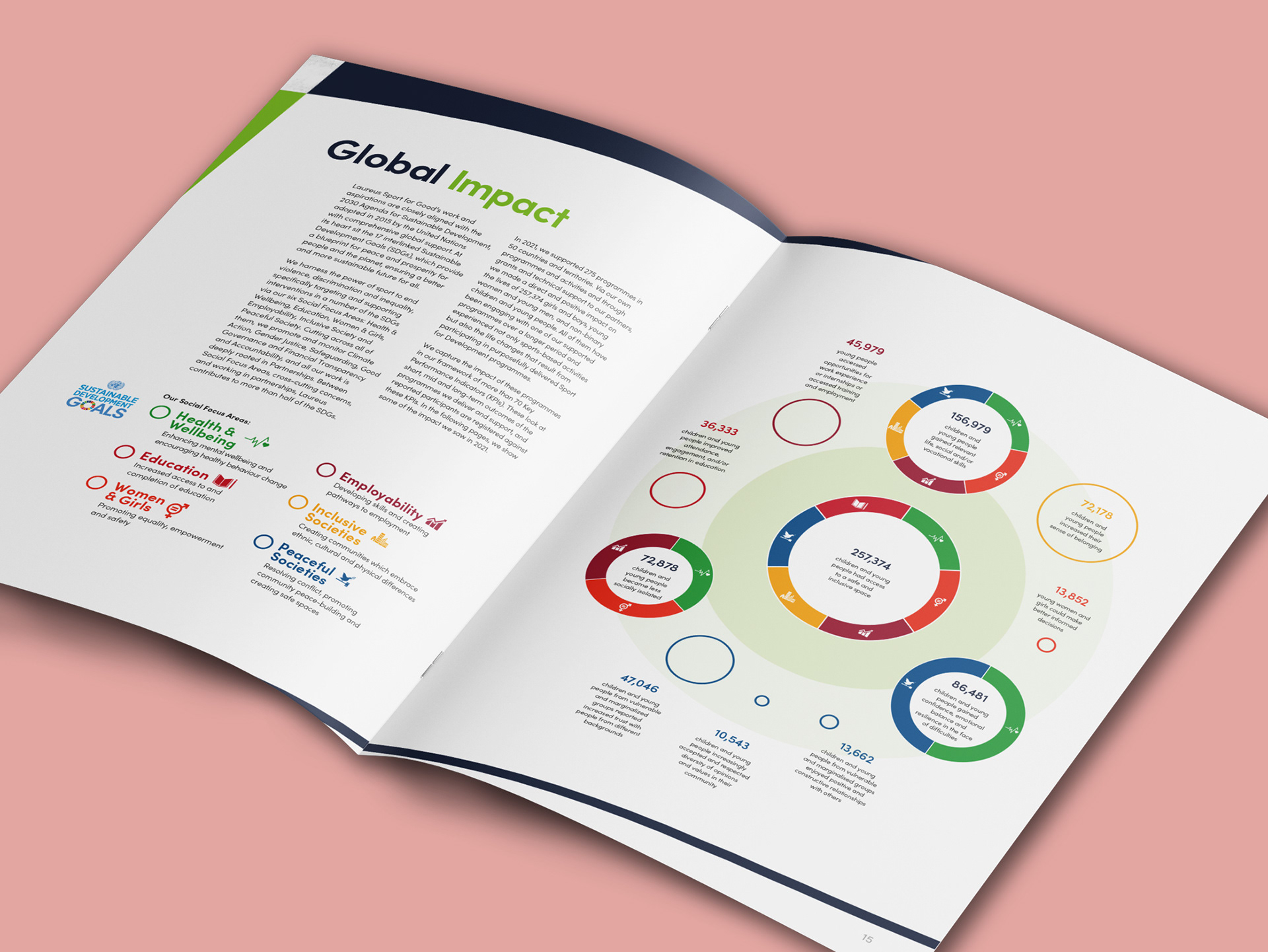 Using the Laureus brand guidelines to create an Annual Review that is on brand showcasing various pieces of information as infographics that is easy for the reader to understand. This was produced for digital and print based on the same layout.